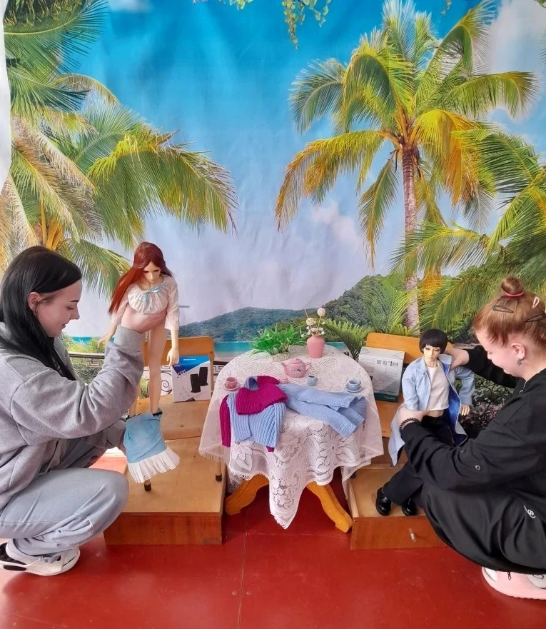 Вторым уровнем «загадки» стала композиция посиделок в кафе. Здесь использовались более миниатюрные, но не менее сложные силиконовые шарнирные куклы на металлическом каркасе (формат 1/6). Задача оказалась не из легких: участникам предстояло добавить недостающего персонажа, найти лишний реквизит, сменить костюмы и даже перераспределить роли. Кульминацией этого блока стала демонстрация технологичной головы куклы с подвижными глазами, которая позволяет добиваться максимальной реалистичности в сценах.